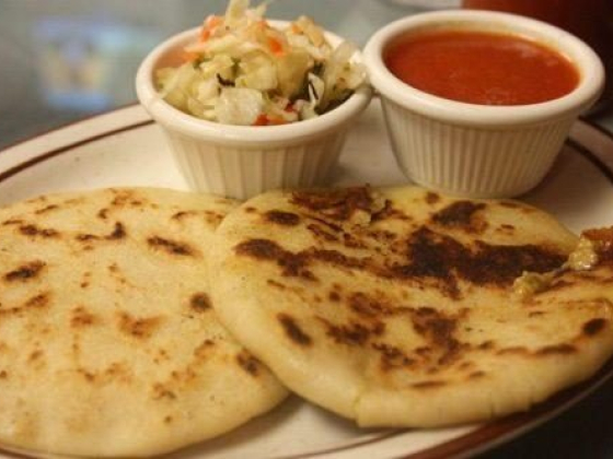 Hand-made corn tortillas stuffed with various fillings such as beans, loroco (a local edible flower), pork and cheese. It is topped with homemade tomato sauce and served with sour cabbage salad. Read the full article here.