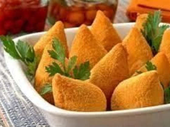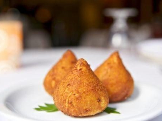 Coxinha (a.k.a. “coxinha de frango” co-SHEEN-ya dee FRAHN-goo, or “coxinha de galinha” co-SHEEN-ya dee ga-LEEN-ya) is a popular Brazilian street food which is a boneless teardrop-shaped croquette containing chicken meat. It is usually eaten as a snack or appetizer.