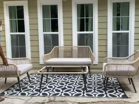 Today, we'll share some cozy outdoor decorating ideas as we do our pitch makeover. I'm going to get one of my outdoor living spaces set up. What I've chosen for the space is a four-piece set that comes with two chairs, a love seat, and a coffee table in the color natural.