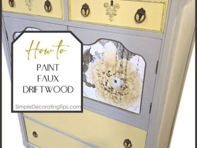 I just redid this vintage dresser in yellow and grey, taking color cues from the sepia floral decoupage paper I put on the inset door panels, and wanted a bit of a weathered contrast for the top. A super simple, (and quick!) treatment of faux driftwood totally done with paint was the answer.