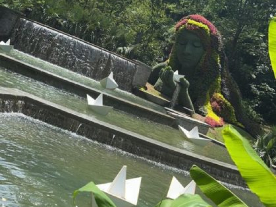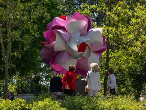Throughout the garden are large-scale sculptures of flying birds, emerging butterflies, grazing deer, floating boats and more.