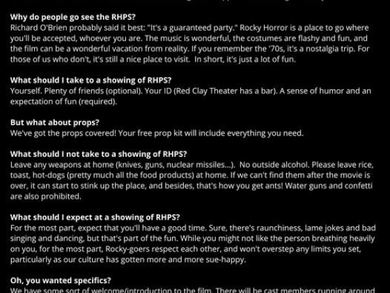 This event is free to attend and admission will be provided on a first-come, first-served basis. Seating is limited. Doors will open at a 11:30pm. Free prop kits will be given to all guests. The Red Clay Theatre bar will be open during the show.