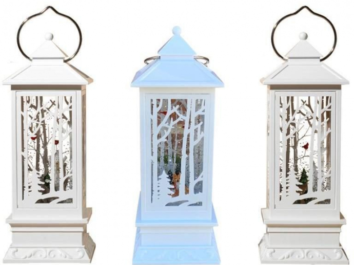 Shine some light onto your home decor with these gorgeous white lanterns with cardinals! Each of them feature a tiny winter scene! Turn it on and watch the glitter inside twirl and spin and sparkle! Requires 3 AA Batteries (not included). Choose one of three styles, each sold individually. Choose a mischievous fox, a dainty little dear, or a fearsome wolf! Made of plastic. Dimensions: 10" tall.