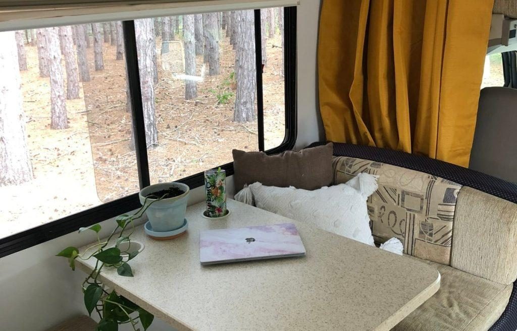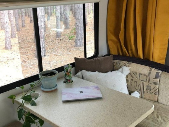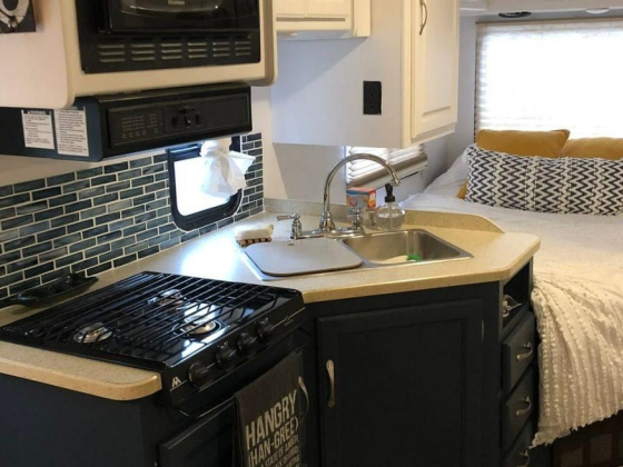 The Ash Van has a pantry, four burner stove, fridge and convention microwave oven. The kitchen comes completely stocked with plates, cups, bowls, cooking utensils, and flatware, all at no extra charge. Additionally, there are camping chairs & hot dog stick for cooking food on the fire or a portable stove for cooking outside.