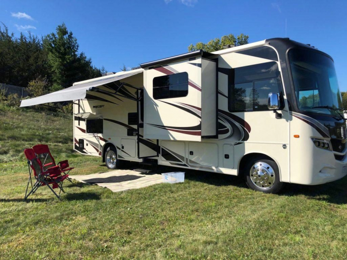 Like new 32 foot RV with the largest 120-inch windshield in the industry and is driven by a 6.8L V-10 320 HP gas engine with electronic fuel injection and 460 lb-ft torque. The 6-speed automatic TorqShift transmission includes overdrive and tow-haul mode and cruise control for those long stretches of highway. 3 slideouts with sleeping bunk above driving area with 750 pound capacity. Equipped with Jayco's exclusive ride and handling package! Also equipped with Jayco's exclusive Garmin infotainment system (detachable touch screen that doubles as a custom RV navigation and four-zone AM/FM/Bluetooth/USB entertainment system. Precept kitchens feature solid-surface countertops with an extension, an integrated stainless steel sink and decorative backsplash, a 3 burner range with 9,000-BTU SuperBurner and piezo igniter and convection microwave. A king bed, reading lights, 32-inch TV, window treatments and incredible storage/closets infuse style and comfort into the master bedroom located in the rear. The bathroom area is unique in that the shower with built in skylight is located across the way from the separate toilet area with a private door. Includes a porcelain toilet with foot flush and roof vent. Both driver and passenger seat are super comfortable 6-way power, swivel Flexsteel chairs. Have movie night under the stars! The outdoor entertainment center is part of this RV's package and includes an LED TV mounted on a swivel bracket and a single disc DVD/FM radio. Make the most of every opportunity to enjoy the great outdoors with the easy to use electric patio awning fitted with an LED light strip. Inventive storage designs, like the pullout kitchen pantry, help travelers make the most of Precept's interior spaces. Extra tall padded vinyl ceilings, measuring 84 inches in height, with high-intensity, recessed LED lights give a residential feel. The Dream Dinette easily raises and lowers, to convert from table space to a sleeping area.