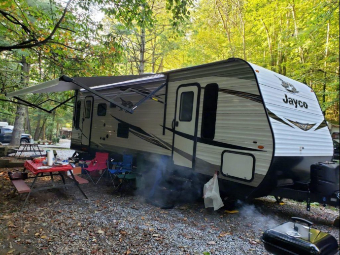This like new 2019 Jayco 26ft travel trailer with slide has all the comforts of home including linens,pots and pans, dishes, silverware, etc. Smart TV in living room, tv in bedroom, sleeps 4, has jackknife sofa, microwave and much more. We will deliver & set up at location of your choice within 60 miles, full-hook ups only. We are located near Maggie Valley, Cherokee, Asheville, Great Smoky Mountains Park, Blue Ridge Parkway and Bryson City.