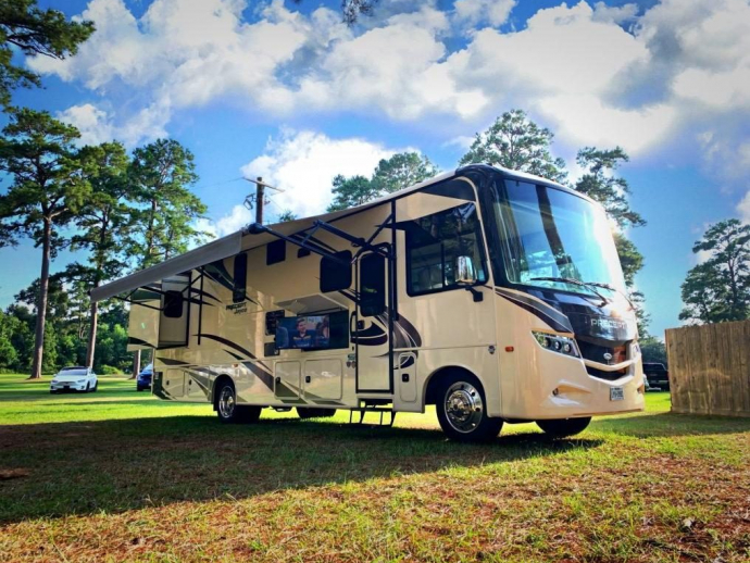 This RV is top notch! Fireplace, hideaway queen bed above drivers seat for the extra sleeping capacity. Huge TVs inside and out!!!! Come check Penny out and see for yourself!