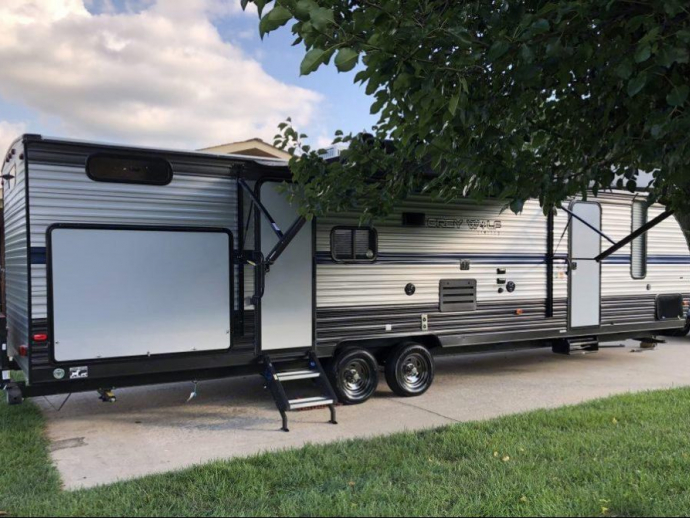 Brand new 33 foot travel trailer with a bunkhouse with 3 bunk beds and dresser. Featuring a large living area with a great kitchen that includes an apron style stainless sink that matches the stove and microwave. A wraparound dinette that will seat the whole family during meals or game time. The leather couch sets in front of the television and also makes a bed. The 3-entry bathroom includes a roomy standup shower, toilet and a sink that you can access from the main room, bedroom as well as from outside. The master bedroom has two closets and a comfortable queen size bed. Outside of the camper has a shower to rinse off with, an outdoor kitchen that has a sink, refrigerator/freezer as well as an icemaker and two burner stove.