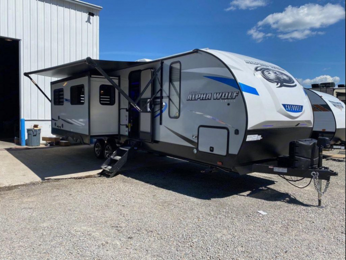One of the most popular and spacious couples coach. Interior highlights include dual opposing slides, a rear deluxe tri-fold hide-a-bed, plush theatre seats with heat-light-massage, stylish freestanding table with 4 seats, panoramic rear window for a view of the lake, large kitchen island with farm style sink, radius shower with opaque glass doors, bath linen and dual bedroom access. Enjoy the outdoors, good times and great friends under your oversized 20’ exterior awning.