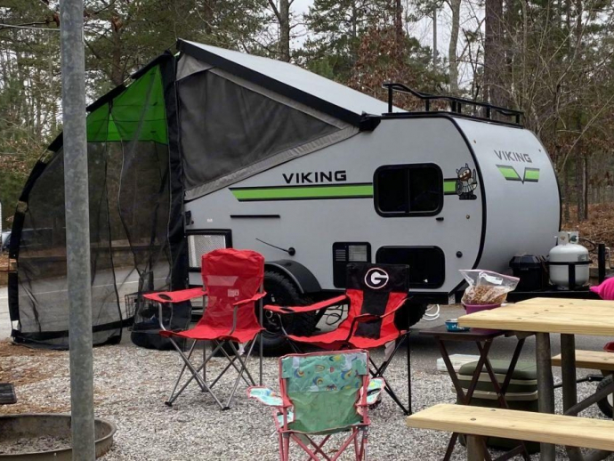 This camper is new and very clean. Don't let the size fool you, its very spacious and comfortable. The smaller size does make it easier to tow and allows for more space at your camp site. This unit has all the upgrades, This includes a roof rack for storage, a screened in add on room for relaxing outside, a mini fridge, A/C and a furnace, an inside sink, blue tooth radio, storage cabinets, a queen size bed, and an outside shower unit. This camper has a water heater and a 16 gallon water tank for dry camping. The tires are the upgraded off-road tires for traveling anywhere. Under the camper is a large storage area for all the extras you want to add on.