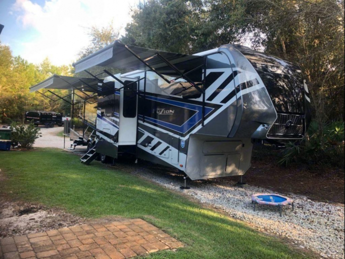 This is a 2021 just purchased in October keystone Fuzion 429 model. This unit does have full body paint on the exterior which most fifth wheel toy haulers do not have. Outside features a rear patio with awning to enjoy those beautiful mornings with a cup of joe. Also on the front door side there is a compartment that features a 32” smart tv. The main front door does have full rigid stairs that connect from the door sill to the ground that help with less rocking of the unit when others enter. This camper also has the new triple chill AC package which enables you easily use all three AC units while still having plenty of power to operate other items. Most campers pre 2020 do not offer this feature which is heavily needed to keep it ice cold inside.