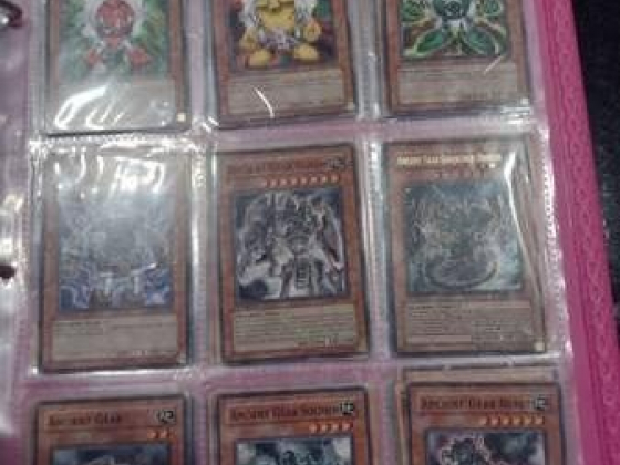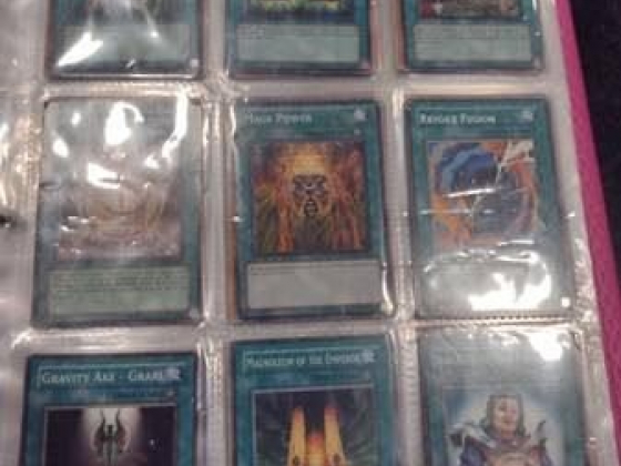 A collection of approximately 500 yugioh cards in a binder, including monster, spell and trap cards. Cards are in playable condition. Included is a Blue Eyes White Dragon, Two Dark Magicians, Red Eyes Black Dragon, and a variety of powerful spells and traps.