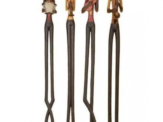 Tall, lean, African American jazz musician figurines playing a horn, accordion, saxophone, and guitar