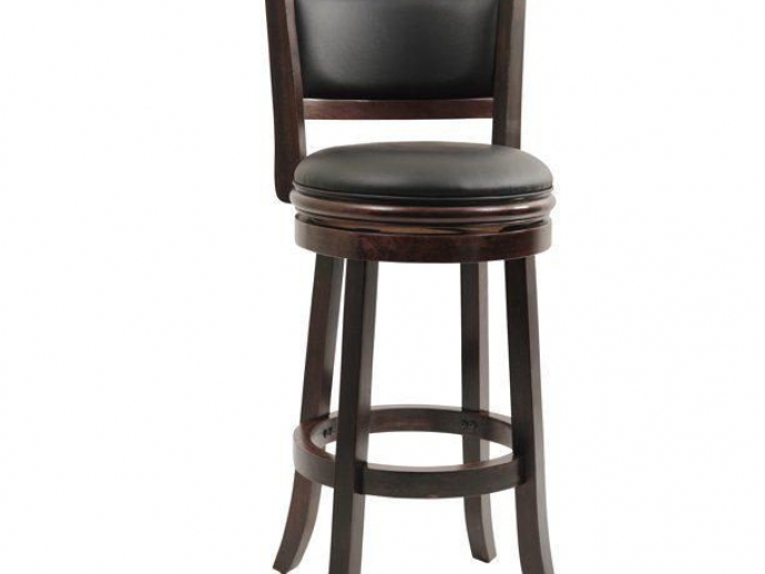 Add comfort and style to your home with this Augusta Swivel Bar Stool. Its frame is constructed of solid RTA hardwood. The seat on this 29" bar stool is made from high-density FR foam and covered with rich-looking, durable faux leather. A sturdy footrest adds comfort while elegantly flared legs contribute to this chair's classic overall appearance. The cappuccino finish of this sleek Augusta bar stool would work well with a wide variety of decors. A seat band effectively hides the swivel mechanism to give this stool a more finished look. This impressive 29" bar stool also features steel ball bearings for a smooth swivel, a sturdy PVC seat and back, and classic detailing. Some assembly is required. The Augusta Swivel Bar Stool would look great in a bar area or kitchen. It could also be paired with a high pub table (sold separately) and serve as a kitchen chair in a small apartment.