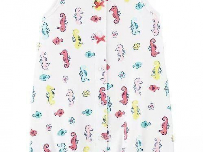 For your little beach baby. A sweet seahorse print adds fun color to this comfy cotton romper from Carter's.