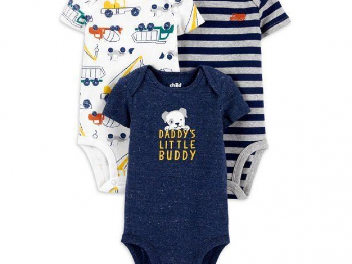 New styles, same great value. Fresh looks you’ll love made with the quality you trust from Carter’s. Super sweet and comfy in soft ribbed cotton, this 3-pack of short-sleeve bodysuits from Child Of Mine by Carter's is a must-have in every baby boy's wardrobe. With adorable animal prints and graphics, this essential set gives his outfits lots of character! Like all styles made by Carter's, these bodysuits are built with strong snaps that keep up with wear, wash, repeat. Overlapping shoulders make over-the-head easy, plus each piece is tagless for no itchies... whew!