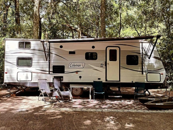 *Fully stocked* 2016 30 ft Coleman camper with gas stove and electric water heater, one slide out, couch, double bunks, table that converts to a bed, master room with queen bed, linens, wash clothes, and towels all washed in the highest temperature setting, all paper products needed for eating, pots, pans, toaster, standard coffee pot, dual DVD players, board games, corn hole, outdoor setup, fire pit, AND KAYAKS! (up charge)