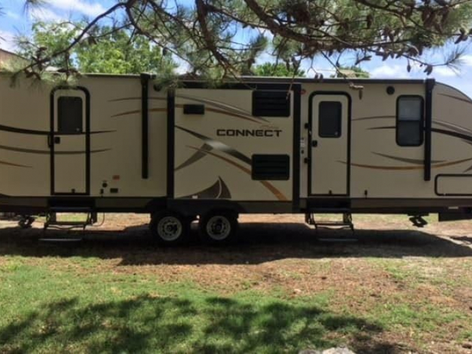 This travel trailer contains a bunkhouse with double size beds on one end and a queen bed on the other end. Two slides make the inside of this trailer very spacious. Two exterior doors, one leading into the bathroom. The kitchen island adds extra counter space.
