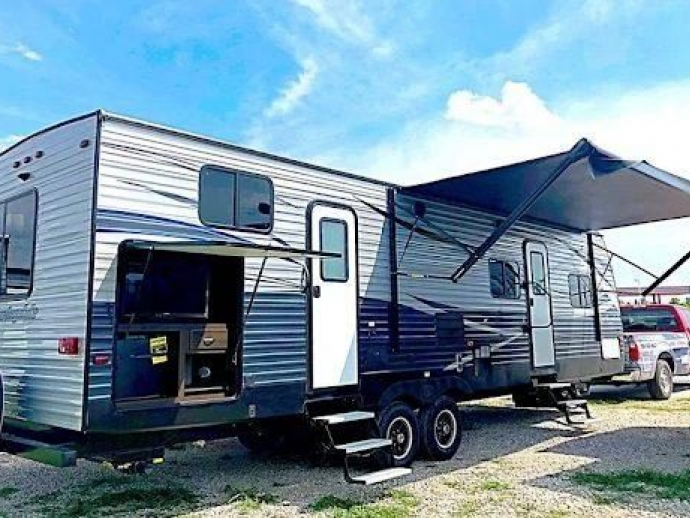 This trailer includes a full kitchen (stove, oven, microwave and sink). Dishes for 8 included, a cookie sheet, pan, pot and cooking utensils. This trailer also comes with a full bathroom (toilet, sink and shower) with a door leading to the outside. Not only do you get the kitchen and entertainment inside but the outside also includes an outdoor shower, entertainment center, TV, indoor/outdoor speakers, retractable awning and can run off propane or electric hookups!!!